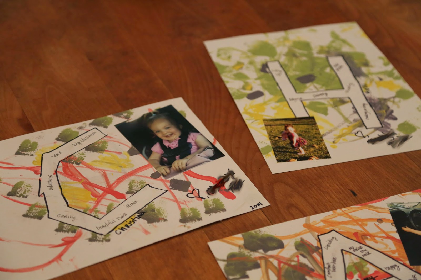 She made one for each of her teachers, and I had her talk about the teacher as she was working on it. When she was finished I wrote out the first initial of each teacher, and filled it in with some of the things that EG shared with me. Not exactly the most sophisticated thoughts, but I hope it shows each teacher how much she appreciates them. I signed her name, and dated each one. Sorry for the blurry, but I think it's important to give EG a little bit of privacy...